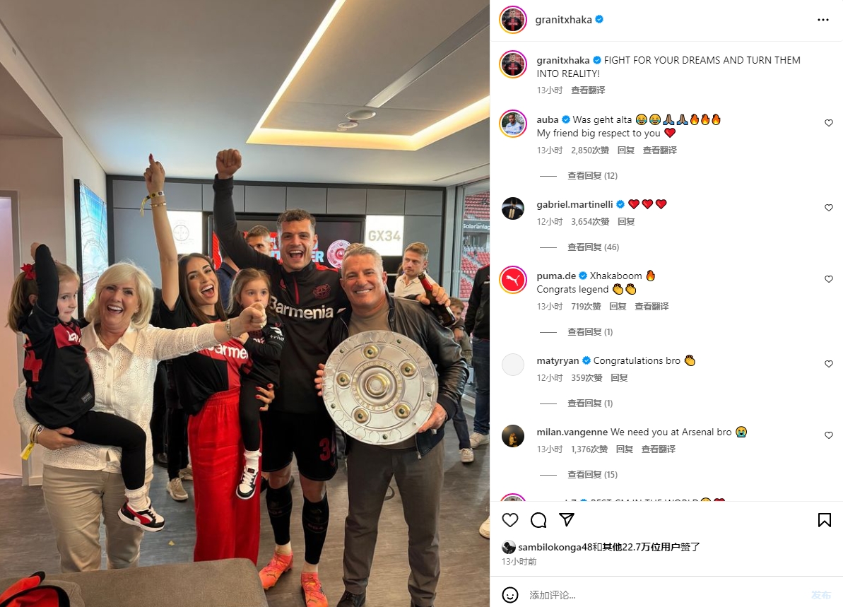 扎卡社媒晒家人合照庆祝夺冠,奥巴梅扬、马丁内利留言祝贺