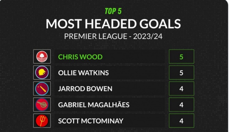 英超头球进球榜:伍德、沃特金斯5球居首,加布里埃尔4球并列次席