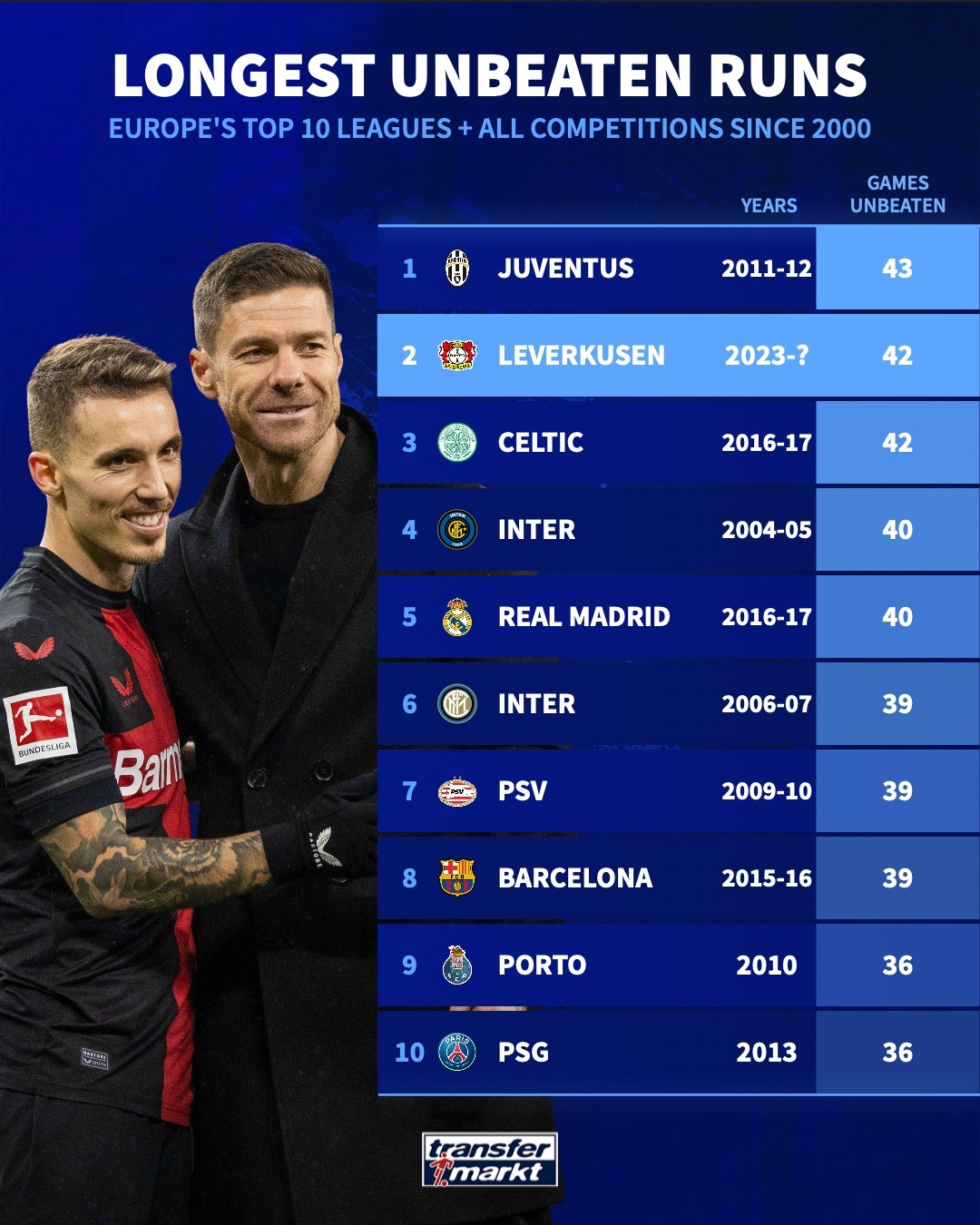 21世纪欧洲前十联赛不败场次:尤文43场榜首,勒沃库森42场第二
