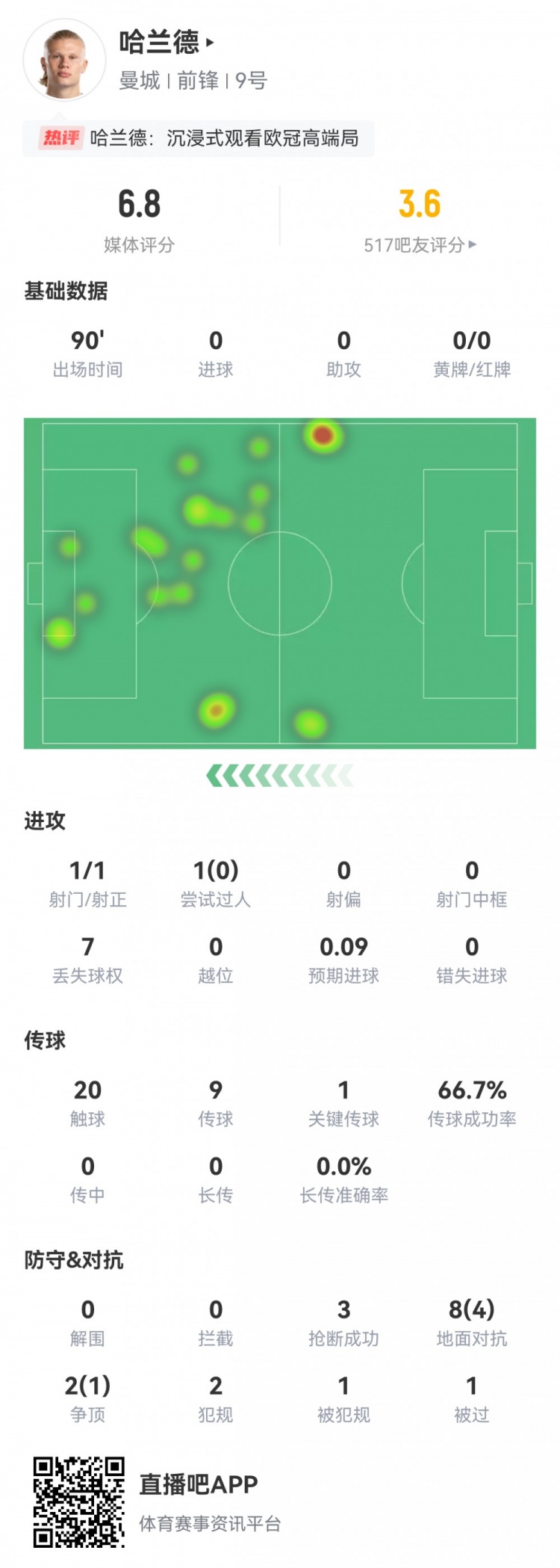 沉浸式观赛????哈兰德本场数据:20次触球,1射1正,7次丢失球权