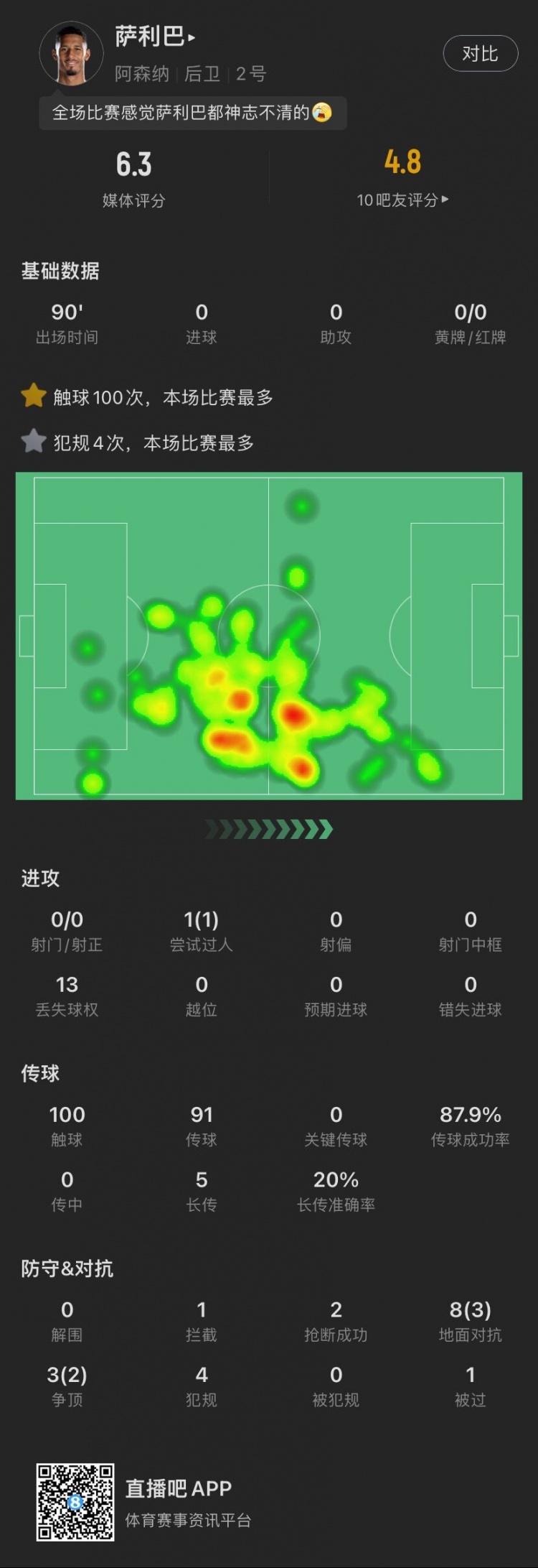 萨利巴本场:4次犯规+送点,贡献1拦截2抢断,获评6.3分全场最低