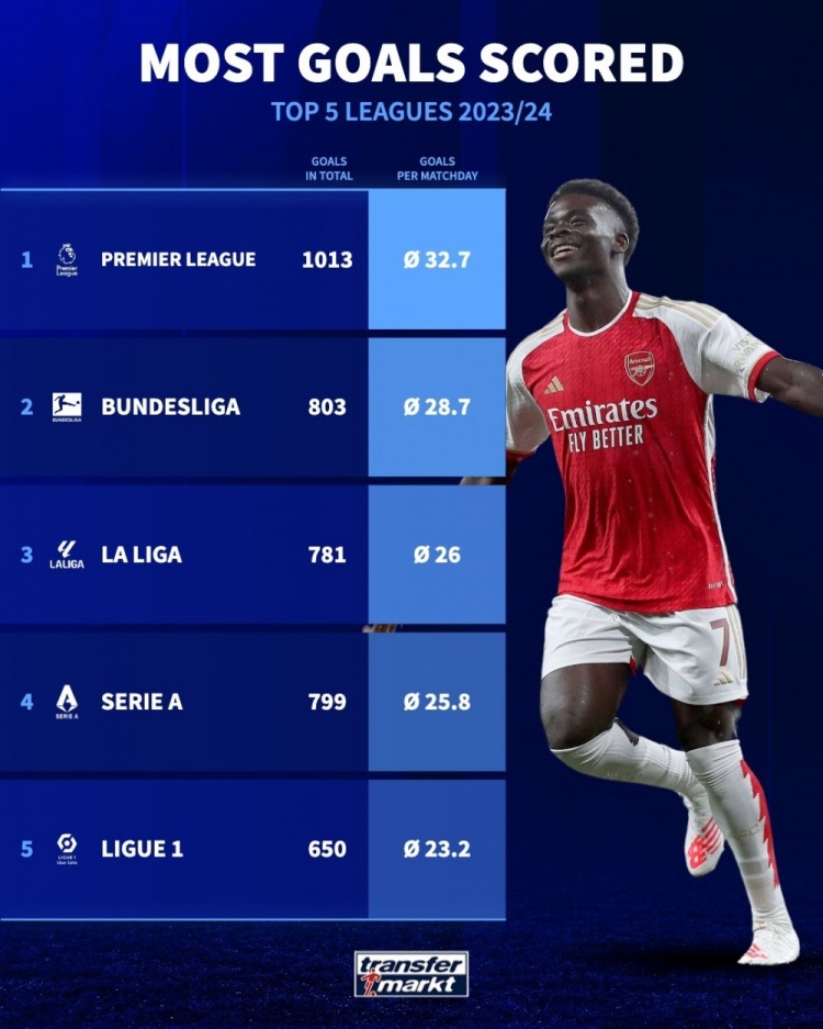 五大联赛每轮平均进球榜:英超32.7球居首,德甲次席&法甲垫底