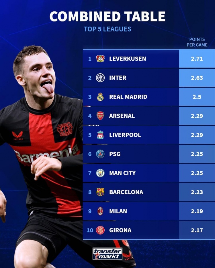 五大联赛场均积分榜:勒沃库森2.71分居首,国米、皇马二三位