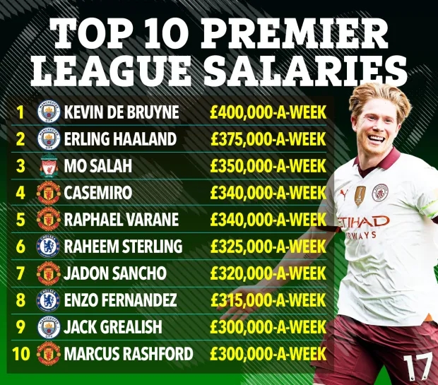 英超球员周薪排行:德布劳内、哈兰德前二,4名曼联球员进前十