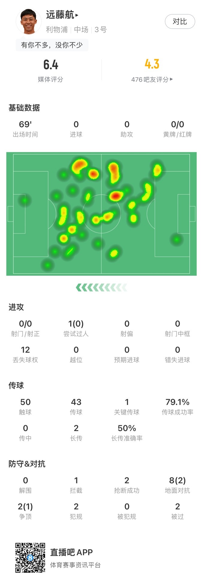 远藤航数据:12次丢失球权,8次对抗成功2次,6.4分队内第二低