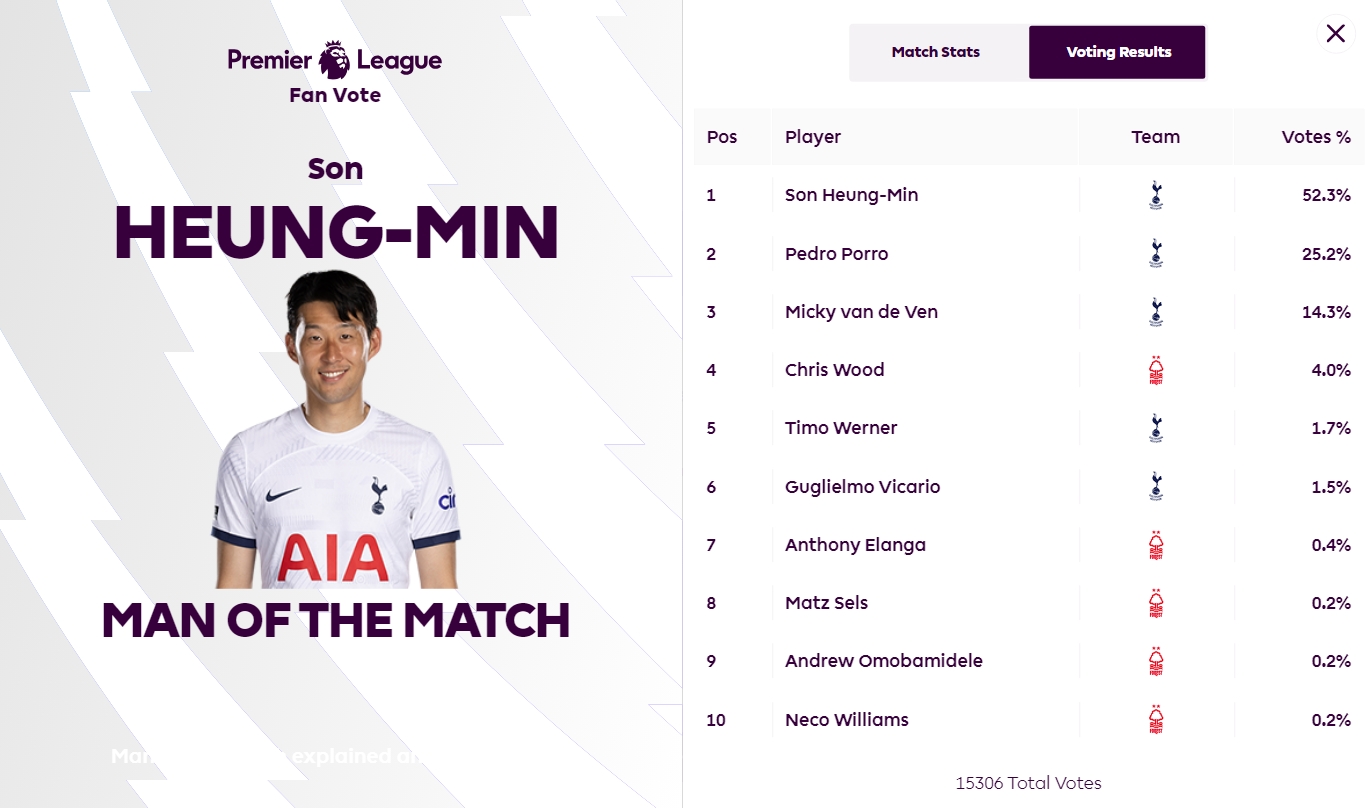 1助攻2关键传球,孙兴慜52.3%得票率当选热刺3-1森林全场最佳