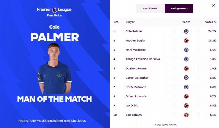 人气拉满!送出助攻的帕尔默绝对优势当选全场最佳球员