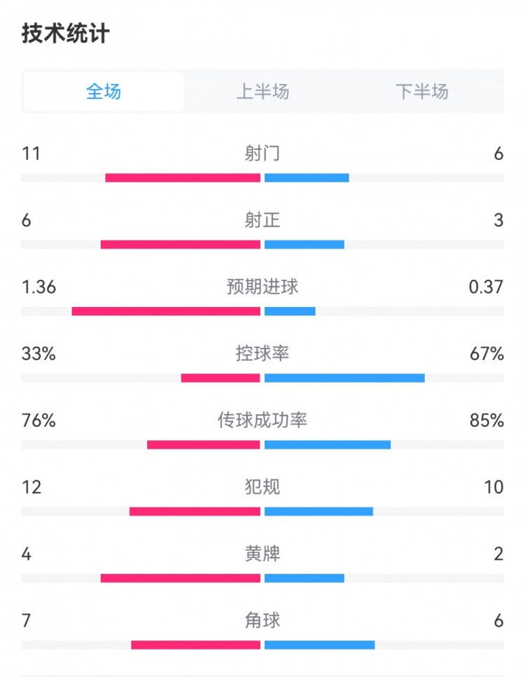切尔西2-2谢菲联数据:射门6-11,射正3-6,预期进球0.37-1.36