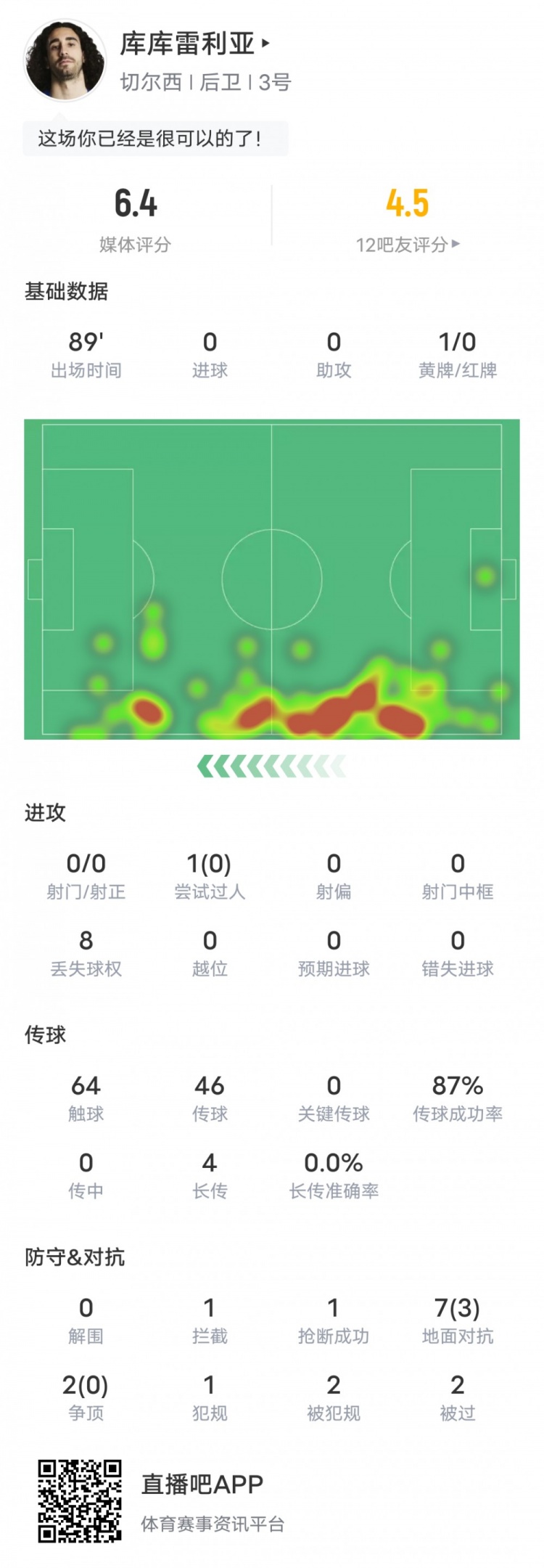 库库雷利亚本场比赛数据:1黄牌传球成功率87%,评分6.4