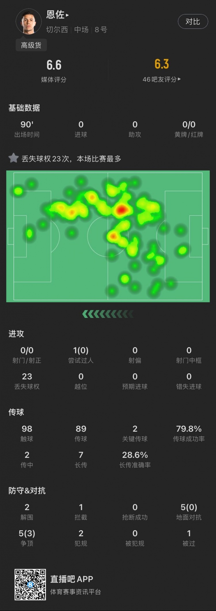 恩佐本场:23次丢失球权全场最多,5次地面对抗全失败,贡献2解围