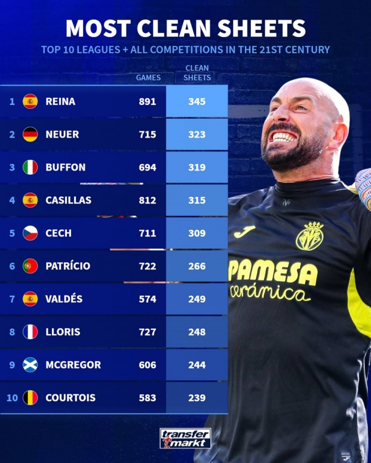 21世纪以来门将零封榜:雷纳345场居首,诺伊尔323场次席