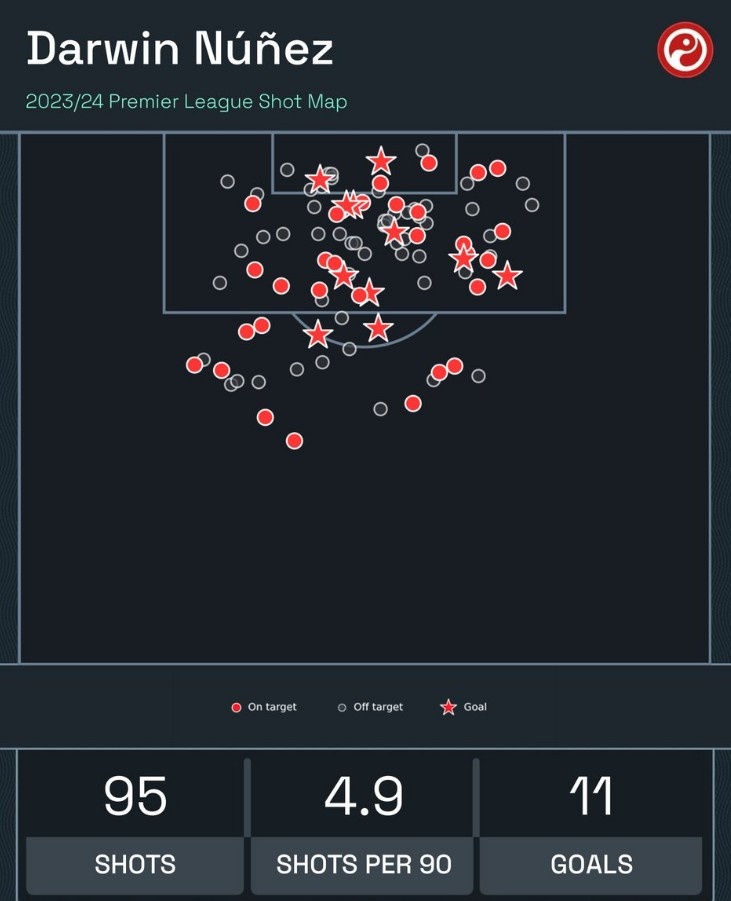 已打进11球,努涅斯本赛季射门95次英超球员最多&每90分钟4.9次