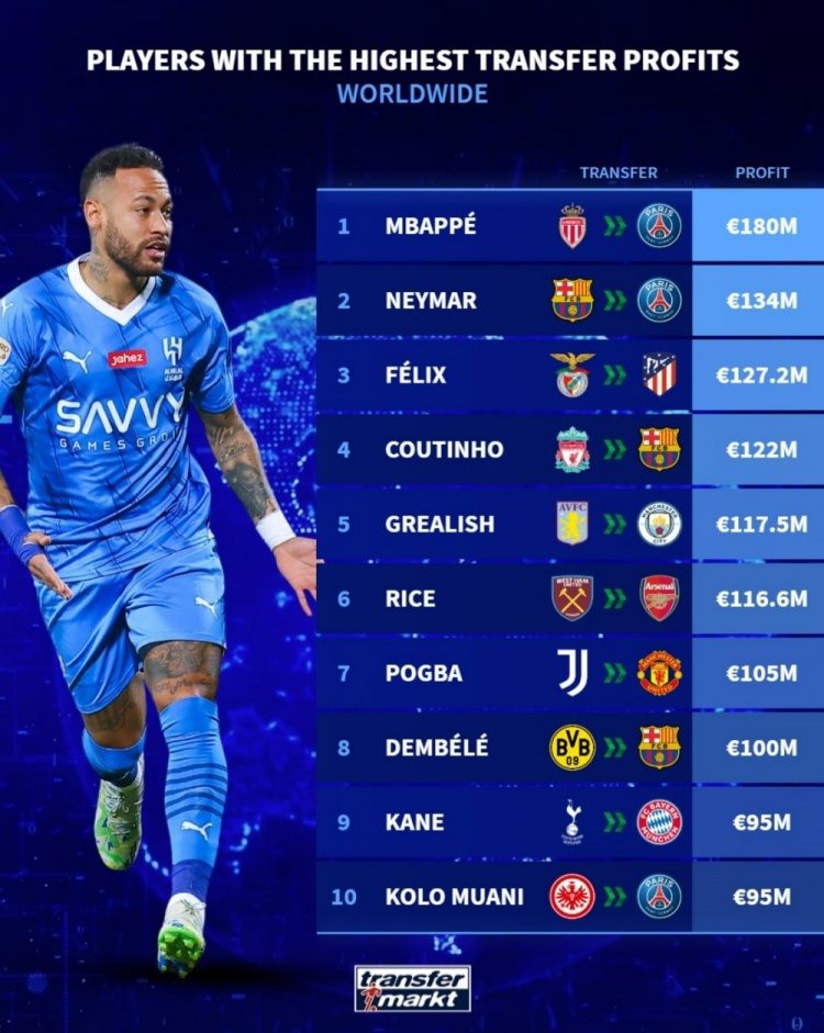 德转列足坛转会利润最高交易榜:姆巴佩1.8亿欧加盟巴黎居首