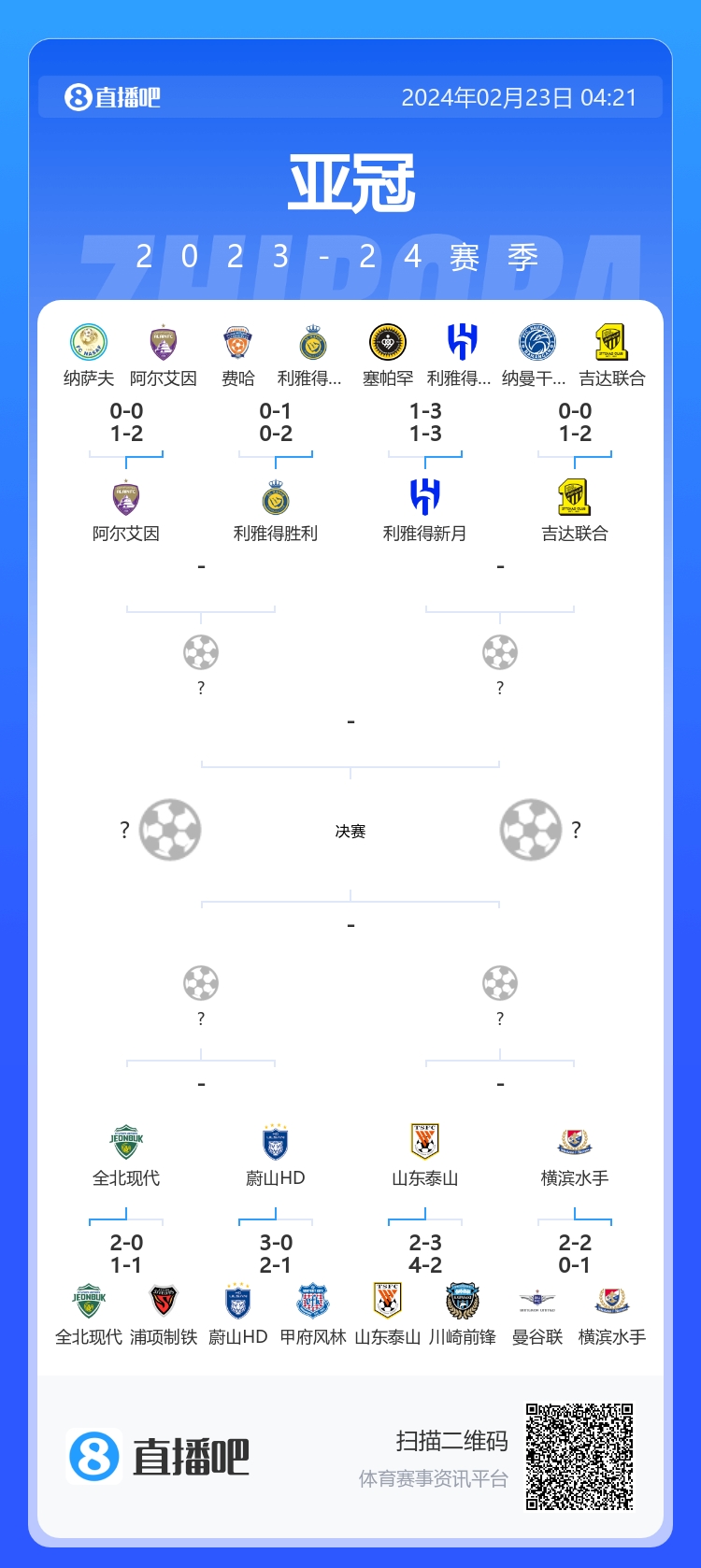 2月23日消息 2023-24赛季亚冠1/8决赛战罢,1/4决赛对阵全部出炉!本届8强中超与J联赛各占一队,K联赛两队,沙特联三队,阿联酋超一队。中超独苗山东泰山将战J联赛球队横滨水手,全北、蔚山上演“现代德比”;利雅得胜利遇上阿尔艾因,利雅得新月大战吉达联合。