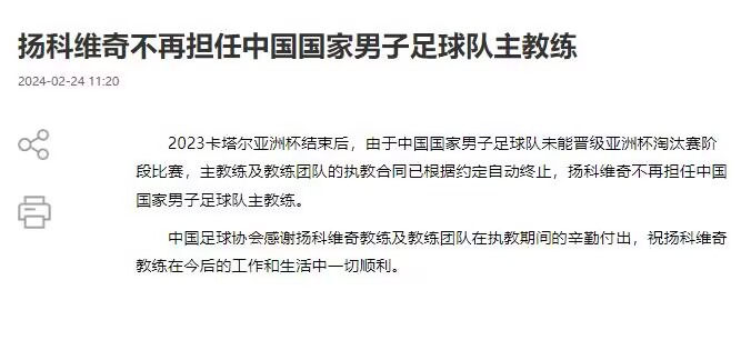中国足球协会感谢扬科维奇教练及教练团队在执教期间的辛勤付出,祝扬科维奇教练在今后的工作和生活中一切顺利。