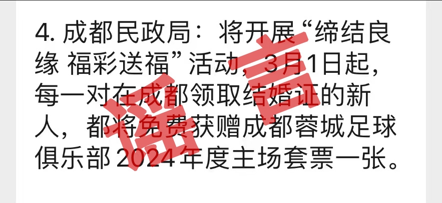02月28日消息 近日,网传成都民政局开展“缔结良缘 福彩送褔”活动。3月1日起,每一对在成都领取结婚证的新人都将免费获赠成都蓉城足球俱乐部2024年度主场套票一张。