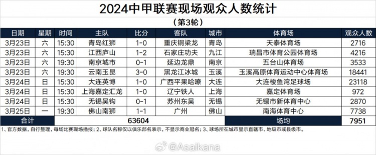 中甲第3轮现场观众人数:大连主场2.3万,嘉定主场仅972人