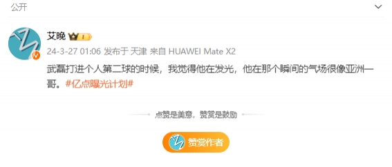 赛后,南方日报记者朱小龙更新社媒:武磊打进个人第二球的时候,我觉得他在发光,他在那个瞬间的气场很像亚洲一哥。