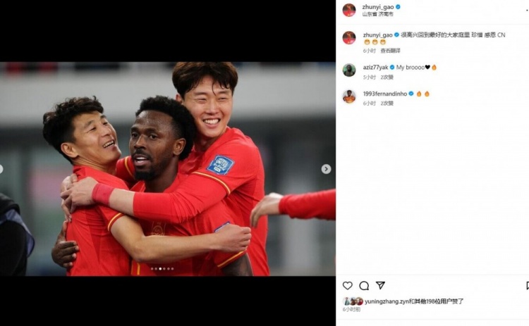 3月28日消息 重返国足并在主场对阵新加坡的比赛中首发登场后,高准翼更新了社媒,晒出了这次为国征战的照片,费南多等人也在评论里为其留言。