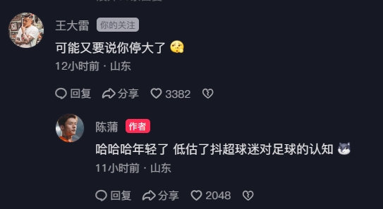 王大雷在评论区CUE了下陈蒲:“可能又要说你停大了”,陈蒲回复:“哈哈哈年轻了,低估了抖超球迷对足球的认知。”