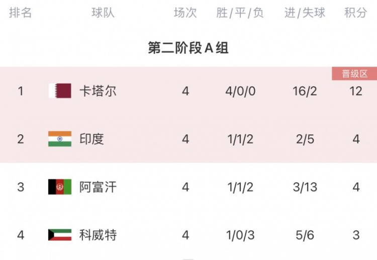 A组的卡塔尔本轮客场2-1击败科威特后,4战全胜稳居小组榜首,领先二三位的印度、阿富汗8分提前出线。