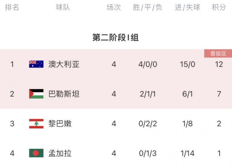 H组的澳大利亚本轮5-0大胜黎巴嫩,4战全胜提前出线。