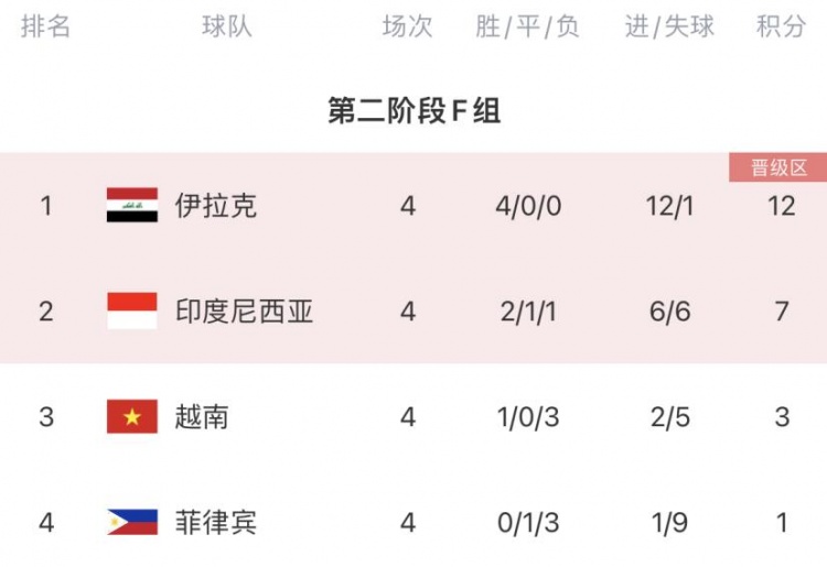 F组的伊拉克客场5-0大胜菲律宾后,4战全胜领先小组第三的越南9分,提前两轮出线。