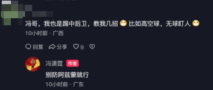 有网友给冯潇霆留言:冯哥,我也是踢中后卫,教我几招,比如高空球,无球盯人。