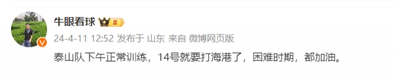 04月11日消息 据泰山跟队牛志明消息,泰山队下午正常训练,困难时期都加油。