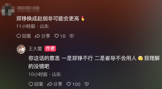 王大雷:你这话的意思,一是郑铮不行,二是崔导不会用人,我理解的没错吧。