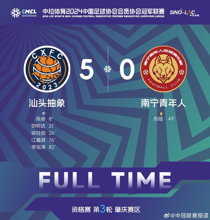 实力更胜一筹的汕头抽象本场比赛几乎占据了绝对主动,开场仅25分钟,陈卓、刘悦达、梁柱俊就先后建功,为汕头抽象建立起3-0的领先优势。比赛末段,江嘉淇、李宪涛又分别破门,最终汕头抽象5-0大胜南宁青年人。