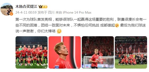 买提江社媒:第一次为球队首发亮相,不惧怕任何挑战,成都雄起!