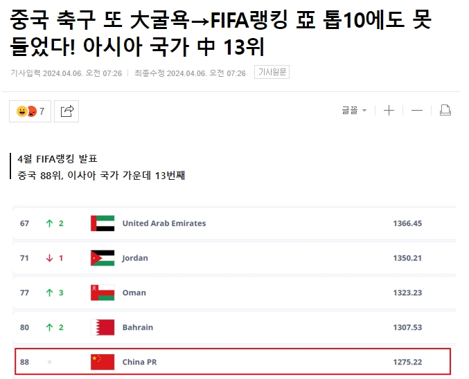 “亚洲三流”!韩媒:中国足球一大耻辱→连FIFA亚洲前十都进不了