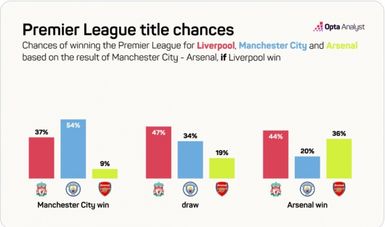 Opta:如本轮曼城与枪手战平,红军今年英超夺冠概率将达47%